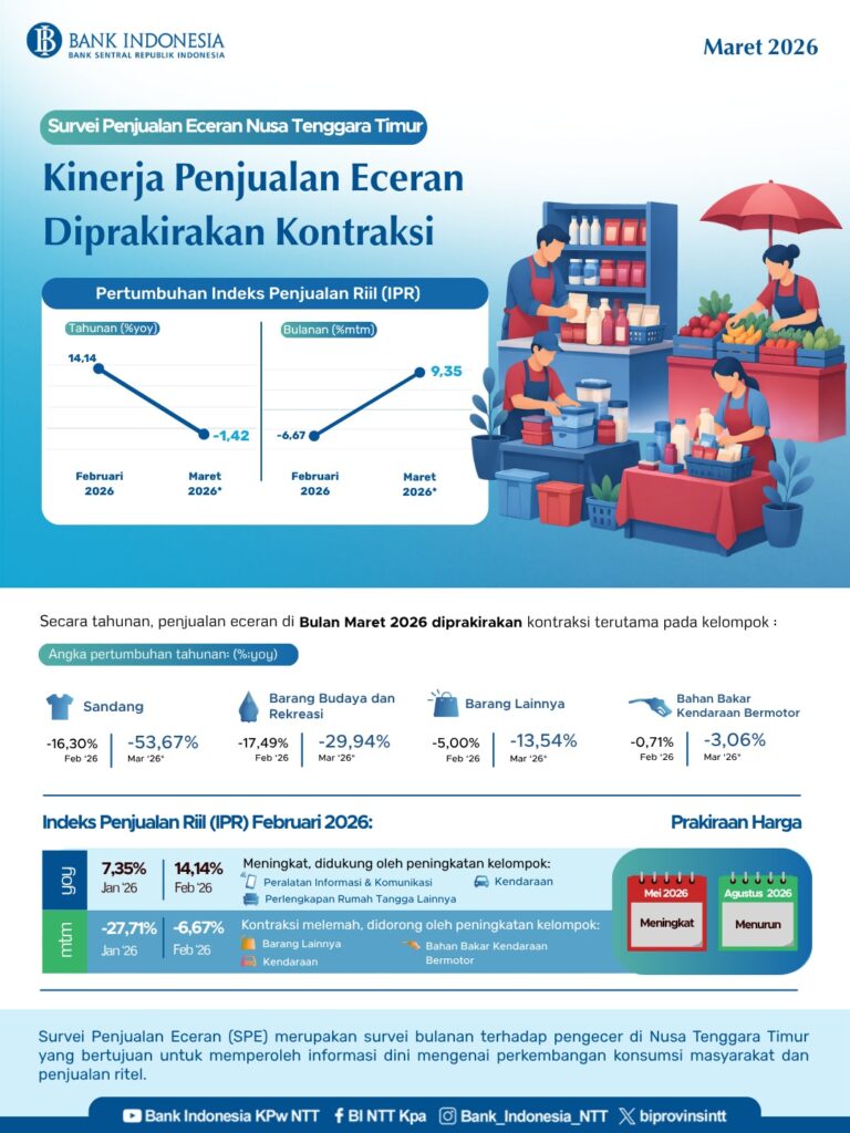 IDETORIAL.com, Kupang – Survei Penjualan Eceran (SPE) Kinerja penjualan eceran pada Maret 2026 diprakirakan mengalami kontraksi secara tahunan. Hal ini tercermin dari perkembangan IPR (yoy) yang menurun dari 14,14% pada Februari menjadi -1,42% pada Maret 2026.